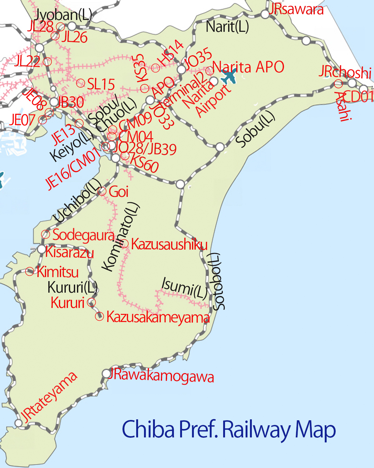On JR lines in Chiba Prefecture, the Sobu Line Rapid Service uses JO⚪⚪, the Sobu Line Local Service uses JB⚪⚪, the Keiyo Line uses JE⚪⚪, the Joban Line uses JL⚪⚪, and the Musashino Line uses JM⚪⚪. On private railways, the Keisei Dentetsu Line uses KS⚪⚪, the Shin-Keisei Dentetsu Line uses SL⚪⚪, the Chiba Urban Monorail uses CM⚪⚪, the Hokuso Railway Line uses HS⚪⚪, and the Choshi Dentetsu Line uses CD⚪⚪.